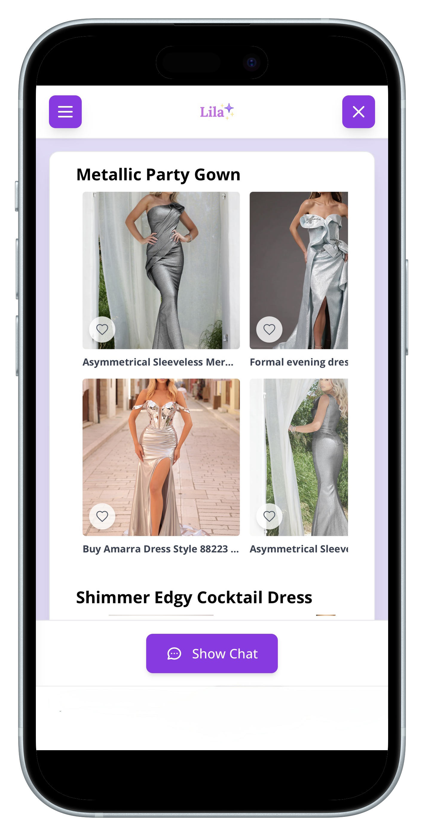 Hi! I'm Lila, your AI Stylist. Chat with me to discover, collab, and favorite to find the one for your special occasion. Easier than ever.
